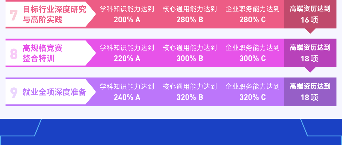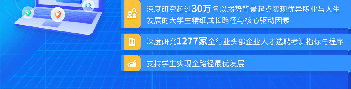 根据对超过1277家全行业龙头企业、典型事业单位和政府机构的深层研究。一切社会组织对大学生的价值判断,主要决定于三类高端能力体系的综合强度,对大学生的招录选拔都是针对三类高端能力所细分的18个指标进行测评判断。只是不同类型机构在18个细分指标的评分权重有所不同
