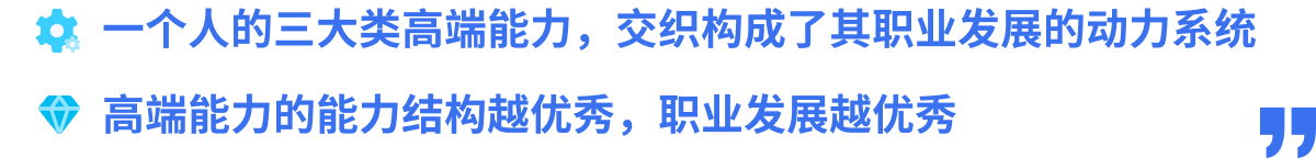 人类的能力体系按照创造社会价值量的高低,分为基本能力与高端能力。基本能力创造低端价值,高端能力创造高端价值。高端能力是人类推动社会发展的主要能力,也就是各类社会组织筛选人才的主要指标,主要由三类构成:学科知识能力、核心通用能力与组织职务能力。三类高端能力的组合就是社会价值的创造力。一个人高端能力的强弱,直接决定了他职业与人生发展的境界